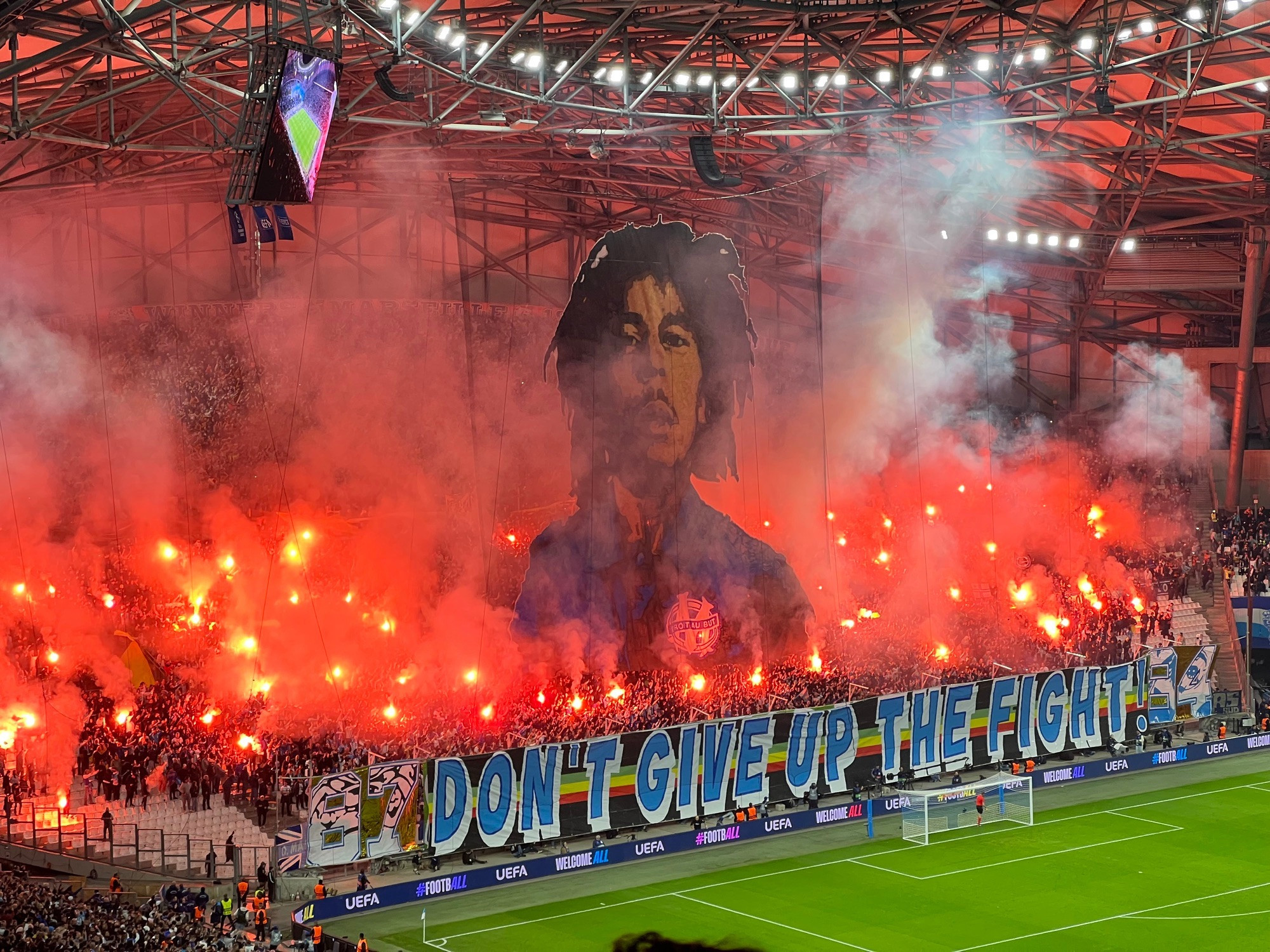 C’est le 4e match de Ligue des Champions, et l’on reste sur des belles performances sur les 3 première matchs mais seulement 3 points. À domicile contre un adversaire à notre portée, il faut absolument prendre les 3 points ce soir. Au niveau ambiance, le Stade est en mode Ligue des Champions, avec des magnifiques tifos. Au Virage Nord, c’est bleu et blanc : de nombreux petits drapeaux et une grand toile sur la partie droite où l’on voit Depé agiter un drapeau. Au Virage Sud, c’est en plusieurs temps : tout d’abord des papiers tendus pour former une immense croix marseillaise, et s’élève un immense Bob Marley avec un maillot de l’OM jusqu’au toit avec un « GET UP STAND UP » en bas du virage… puis les papiers sont retournés et la croix devient jamaïcaine avec « STAND UP FOR YOUR RIGHTS » en bas du virage, et dernière phase avec plein de fumigènes et la phrase en bas devient « DON’T GIVE UP THE FIGHT ».
